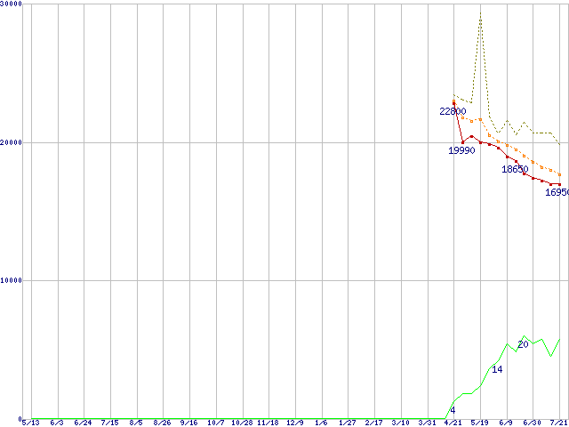 ※このグラフは過去のデータも税率5%相当に調整した税込み相当額のグラフです。 税率変更や、総額表示方式導入(2004年4月)の影響は除いています。 | | | ●凡例 | 最安値 (点線部は販売店未確認 または未調査) | 平均値 | 最高値 | ショップ数 |