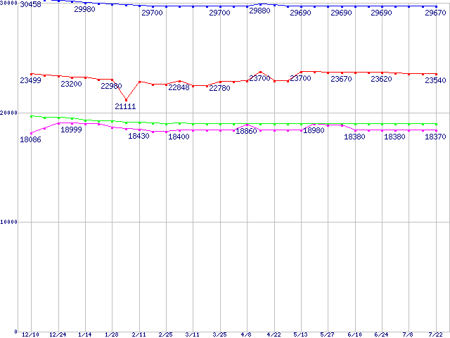 | Socket 478 (FC-PGA2,FSB 800MHz,L2 1MB,Hyper-Threading,Prescott)の最安値推移 | | | (2004年12月10日~2005年7月22日) |