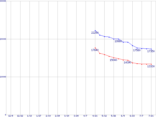 | MaXLine III (7200rpm,16MB,Serial ATA II Phase1,RoHS指令準拠)の最安値推移 | | | (2004年12月9日~2005年7月21日) |