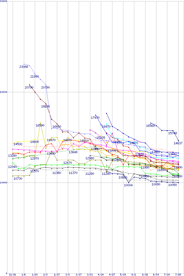 | HDD主要製品(最安値1万円~1万5千円未満)の最安値推移 | | | (2004年12月16日~2005年7月28日) |