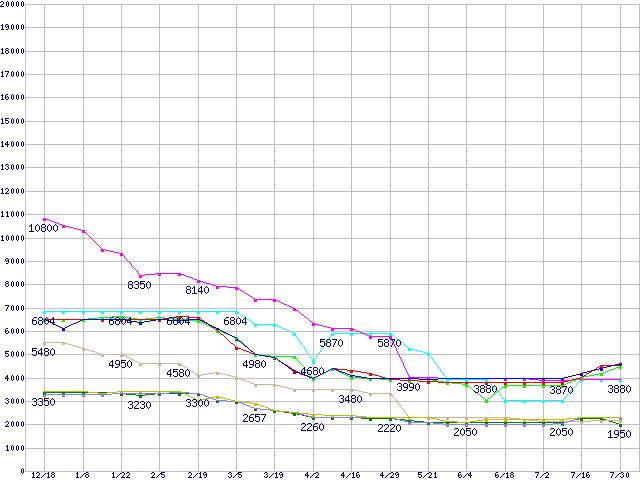 メモリ主要製品(最安値5千円~1万円未満)の最安値推移