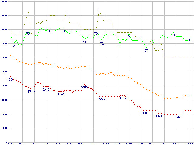 ※このグラフは過去のデータも税率5%相当に調整した税込み相当額のグラフです。 税率変更や、総額表示方式導入(2004年4月)の影響は除いています。 | | | ●凡例 | 最安値 (点線部は販売店未確認 または未調査) | 平均値 | 最高値 | ショップ数 |