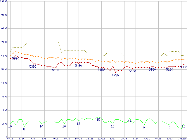 ※このグラフは過去のデータも税率5%相当に調整した税込み相当額のグラフです。 税率変更や、総額表示方式導入(2004年4月)の影響は除いています。 | | | ●凡例 | 最安値 (点線部は販売店未確認 または未調査) | 平均値 | 最高値 | ショップ数 |