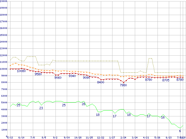 ※このグラフは過去のデータも税率5%相当に調整した税込み相当額のグラフです。 税率変更や、総額表示方式導入(2004年4月)の影響は除いています。 | | | ●凡例 | 最安値 (点線部は販売店未確認 または未調査) | 平均値 | 最高値 | ショップ数 |