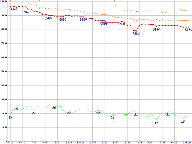 ※このグラフは過去のデータも税率5%相当に調整した税込み相当額のグラフです。 税率変更や、総額表示方式導入(2004年4月)の影響は除いています。 | | | ●凡例 | 最安値 (点線部は販売店未確認 または未調査) | 平均値 | 最高値 | ショップ数 |