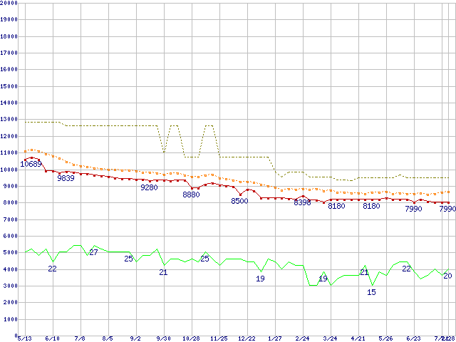 ※このグラフは過去のデータも税率5%相当に調整した税込み相当額のグラフです。 税率変更や、総額表示方式導入(2004年4月)の影響は除いています。 | | | ●凡例 | 最安値 (点線部は販売店未確認 または未調査) | 平均値 | 最高値 | ショップ数 |