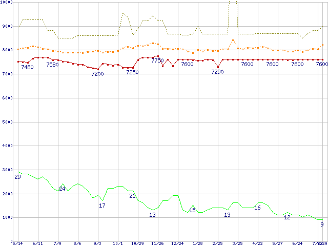 ※このグラフは過去のデータも税率5%相当に調整した税込み相当額のグラフです。 税率変更や、総額表示方式導入(2004年4月)の影響は除いています。 | | | ●凡例 | 最安値 (点線部は販売店未確認 または未調査) | 平均値 | 最高値 | ショップ数 |