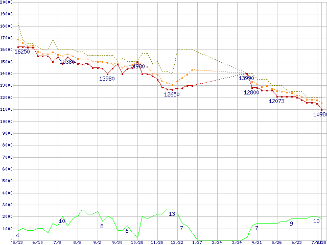 ※このグラフは過去のデータも税率5%相当に調整した税込み相当額のグラフです。 税率変更や、総額表示方式導入(2004年4月)の影響は除いています。 | | | ●凡例 | 最安値 (点線部は販売店未確認 または未調査) | 平均値 | 最高値 | ショップ数 |