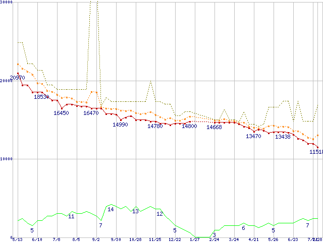 ※このグラフは過去のデータも税率5%相当に調整した税込み相当額のグラフです。 税率変更や、総額表示方式導入(2004年4月)の影響は除いています。 | | | ●凡例 | 最安値 (点線部は販売店未確認 または未調査) | 平均値 | 最高値 | ショップ数 |