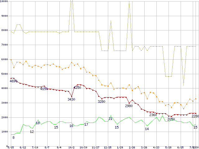 ※このグラフは過去のデータも税率5%相当に調整した税込み相当額のグラフです。 税率変更や、総額表示方式導入(2004年4月)の影響は除いています。 | | | ●凡例 | 最安値 (点線部は販売店未確認 または未調査) | 平均値 | 最高値 | ショップ数 |
