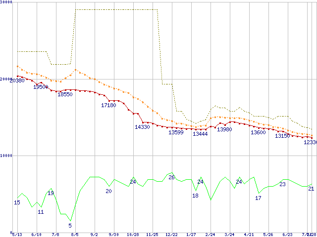 ※このグラフは過去のデータも税率5%相当に調整した税込み相当額のグラフです。 税率変更や、総額表示方式導入(2004年4月)の影響は除いています。 | | | ●凡例 | 最安値 (点線部は販売店未確認 または未調査) | 平均値 | 最高値 | ショップ数 |