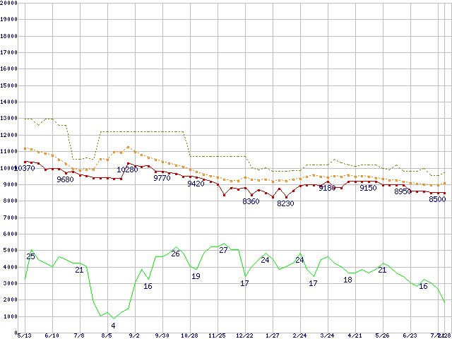 ※このグラフは過去のデータも税率5%相当に調整した税込み相当額のグラフです。 税率変更や、総額表示方式導入(2004年4月)の影響は除いています。 | | | ●凡例 | 最安値 (点線部は販売店未確認 または未調査) | 平均値 | 最高値 | ショップ数 |