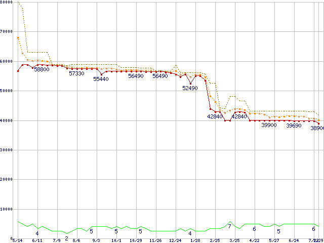 ※このグラフは過去のデータも税率5%相当に調整した税込み相当額のグラフです。 税率変更や、総額表示方式導入(2004年4月)の影響は除いています。 | | | ●凡例 | 最安値 (点線部は販売店未確認 または未調査) | 平均値 | 最高値 | ショップ数 |
