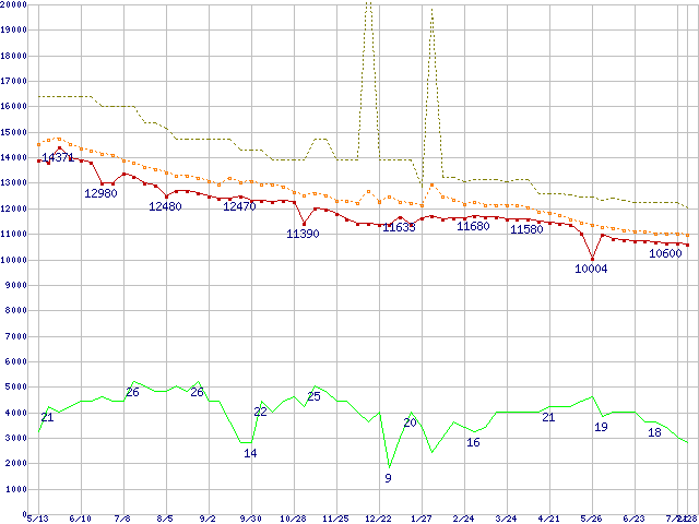 ※このグラフは過去のデータも税率5%相当に調整した税込み相当額のグラフです。 税率変更や、総額表示方式導入(2004年4月)の影響は除いています。 | | | ●凡例 | 最安値 (点線部は販売店未確認 または未調査) | 平均値 | 最高値 | ショップ数 |
