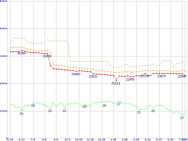 ※このグラフは過去のデータも税率5%相当に調整した税込み相当額のグラフです。 税率変更や、総額表示方式導入(2004年4月)の影響は除いています。 | | | ●凡例 | 最安値 (点線部は販売店未確認 または未調査) | 平均値 | 最高値 | ショップ数 |
