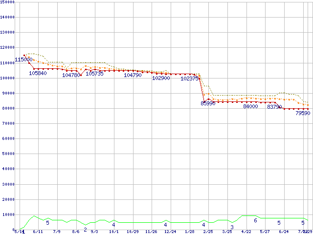 ※このグラフは過去のデータも税率5%相当に調整した税込み相当額のグラフです。 税率変更や、総額表示方式導入(2004年4月)の影響は除いています。 | | | ●凡例 | 最安値 (点線部は販売店未確認 または未調査) | 平均値 | 最高値 | ショップ数 |