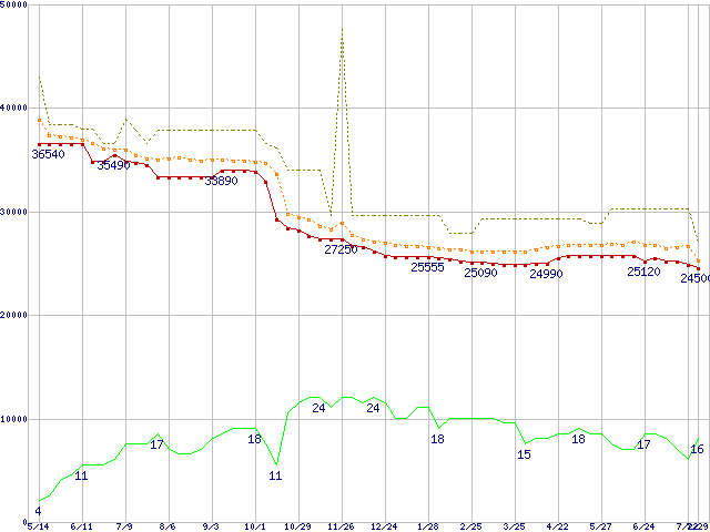 ※このグラフは過去のデータも税率5%相当に調整した税込み相当額のグラフです。 税率変更や、総額表示方式導入(2004年4月)の影響は除いています。 | | | ●凡例 | 最安値 (点線部は販売店未確認 または未調査) | 平均値 | 最高値 | ショップ数 |