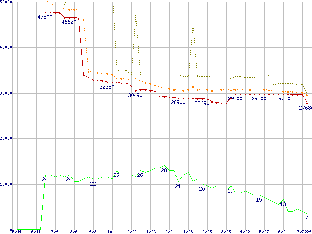 ※このグラフは過去のデータも税率5%相当に調整した税込み相当額のグラフです。 税率変更や、総額表示方式導入(2004年4月)の影響は除いています。 | | | ●凡例 | 最安値 (点線部は販売店未確認 または未調査) | 平均値 | 最高値 | ショップ数 |