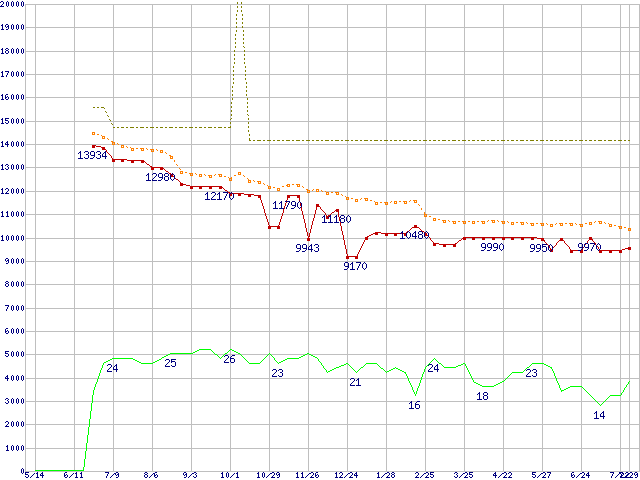 ※このグラフは過去のデータも税率5%相当に調整した税込み相当額のグラフです。 税率変更や、総額表示方式導入(2004年4月)の影響は除いています。 | | | ●凡例 | 最安値 (点線部は販売店未確認 または未調査) | 平均値 | 最高値 | ショップ数 |