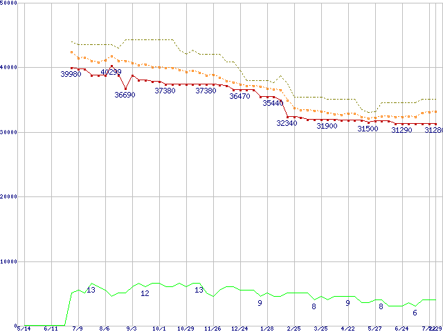 ※このグラフは過去のデータも税率5%相当に調整した税込み相当額のグラフです。 税率変更や、総額表示方式導入(2004年4月)の影響は除いています。 | | | ●凡例 | 最安値 (点線部は販売店未確認 または未調査) | 平均値 | 最高値 | ショップ数 |