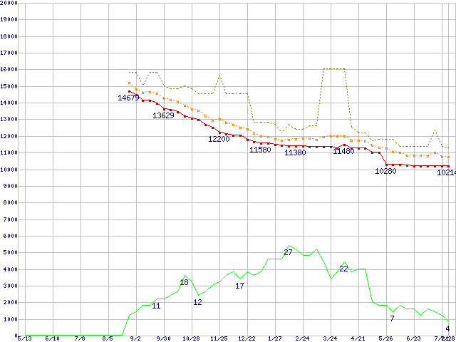 ※このグラフは過去のデータも税率5%相当に調整した税込み相当額のグラフです。 税率変更や、総額表示方式導入(2004年4月)の影響は除いています。 | | | ●凡例 | 最安値 (点線部は販売店未確認 または未調査) | 平均値 | 最高値 | ショップ数 |