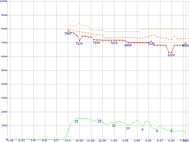 ※このグラフは過去のデータも税率5%相当に調整した税込み相当額のグラフです。 税率変更や、総額表示方式導入(2004年4月)の影響は除いています。 | | | ●凡例 | 最安値 (点線部は販売店未確認 または未調査) | 平均値 | 最高値 | ショップ数 |