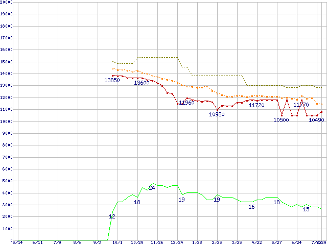 ※このグラフは過去のデータも税率5%相当に調整した税込み相当額のグラフです。 税率変更や、総額表示方式導入(2004年4月)の影響は除いています。 | | | ●凡例 | 最安値 (点線部は販売店未確認 または未調査) | 平均値 | 最高値 | ショップ数 |