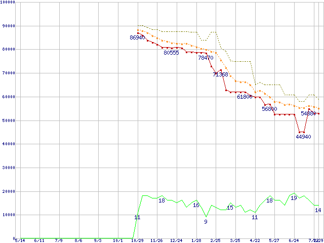 ※このグラフは過去のデータも税率5%相当に調整した税込み相当額のグラフです。 税率変更や、総額表示方式導入(2004年4月)の影響は除いています。 | | | ●凡例 | 最安値 (点線部は販売店未確認 または未調査) | 平均値 | 最高値 | ショップ数 |