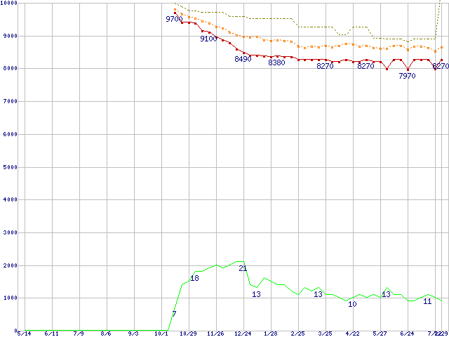※このグラフは過去のデータも税率5%相当に調整した税込み相当額のグラフです。 税率変更や、総額表示方式導入(2004年4月)の影響は除いています。 | | | ●凡例 | 最安値 (点線部は販売店未確認 または未調査) | 平均値 | 最高値 | ショップ数 |