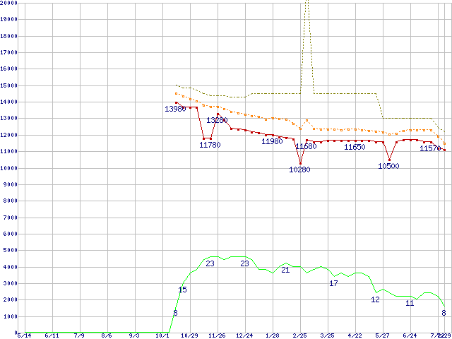 ※このグラフは過去のデータも税率5%相当に調整した税込み相当額のグラフです。 税率変更や、総額表示方式導入(2004年4月)の影響は除いています。 | | | ●凡例 | 最安値 (点線部は販売店未確認 または未調査) | 平均値 | 最高値 | ショップ数 |