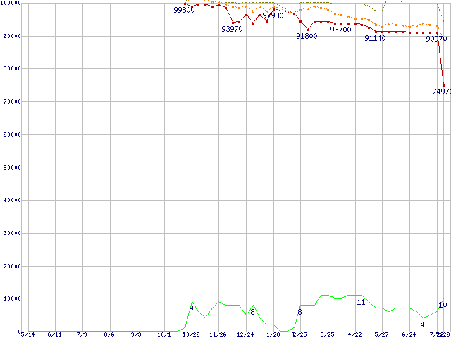 ※このグラフは過去のデータも税率5%相当に調整した税込み相当額のグラフです。 税率変更や、総額表示方式導入(2004年4月)の影響は除いています。 | | | ●凡例 | 最安値 (点線部は販売店未確認 または未調査) | 平均値 | 最高値 | ショップ数 |