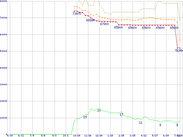 ※このグラフは過去のデータも税率5%相当に調整した税込み相当額のグラフです。 税率変更や、総額表示方式導入(2004年4月)の影響は除いています。 | | | ●凡例 | 最安値 (点線部は販売店未確認 または未調査) | 平均値 | 最高値 | ショップ数 |