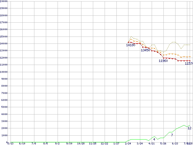 ※このグラフは過去のデータも税率5%相当に調整した税込み相当額のグラフです。 税率変更や、総額表示方式導入(2004年4月)の影響は除いています。 | | | ●凡例 | 最安値 (点線部は販売店未確認 または未調査) | 平均値 | 最高値 | ショップ数 |