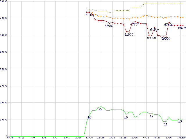 ※このグラフは過去のデータも税率5%相当に調整した税込み相当額のグラフです。 税率変更や、総額表示方式導入(2004年4月)の影響は除いています。 | | | ●凡例 | 最安値 (点線部は販売店未確認 または未調査) | 平均値 | 最高値 | ショップ数 |