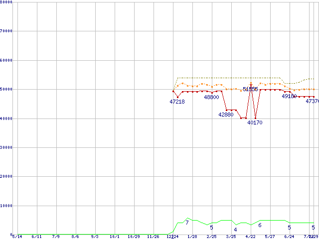 ※このグラフは過去のデータも税率5%相当に調整した税込み相当額のグラフです。 税率変更や、総額表示方式導入(2004年4月)の影響は除いています。 | | | ●凡例 | 最安値 (点線部は販売店未確認 または未調査) | 平均値 | 最高値 | ショップ数 |