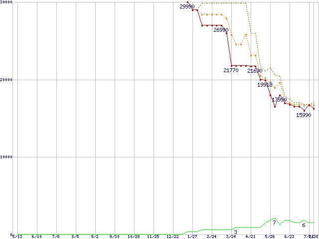 ※このグラフは過去のデータも税率5%相当に調整した税込み相当額のグラフです。 税率変更や、総額表示方式導入(2004年4月)の影響は除いています。 | | | ●凡例 | 最安値 (点線部は販売店未確認 または未調査) | 平均値 | 最高値 | ショップ数 |