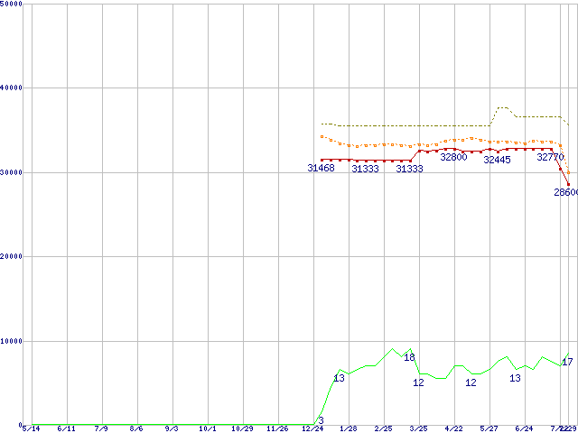 ※このグラフは過去のデータも税率5%相当に調整した税込み相当額のグラフです。 税率変更や、総額表示方式導入(2004年4月)の影響は除いています。 | | | ●凡例 | 最安値 (点線部は販売店未確認 または未調査) | 平均値 | 最高値 | ショップ数 |