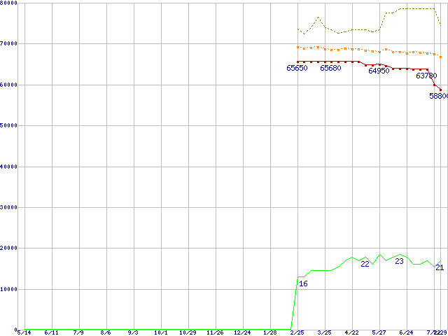 ※このグラフは過去のデータも税率5%相当に調整した税込み相当額のグラフです。 税率変更や、総額表示方式導入(2004年4月)の影響は除いています。 | | | ●凡例 | 最安値 (点線部は販売店未確認 または未調査) | 平均値 | 最高値 | ショップ数 |