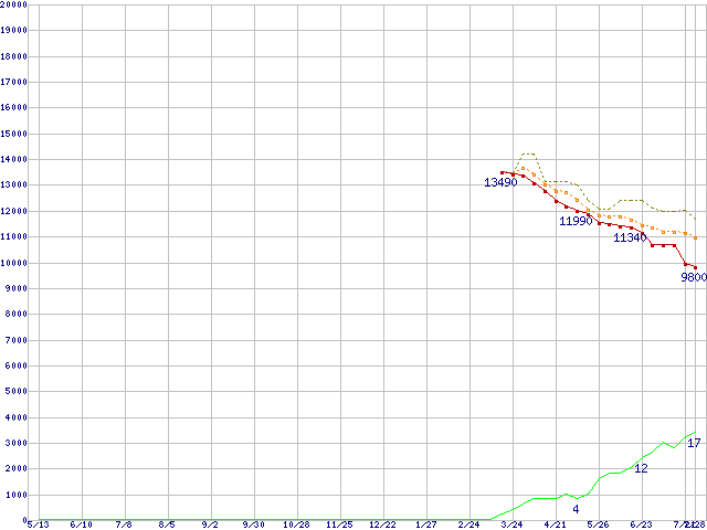 ※このグラフは過去のデータも税率5%相当に調整した税込み相当額のグラフです。 税率変更や、総額表示方式導入(2004年4月)の影響は除いています。 | | | ●凡例 | 最安値 (点線部は販売店未確認 または未調査) | 平均値 | 最高値 | ショップ数 |