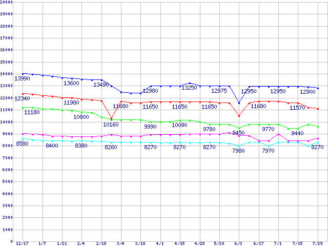 | LGA 775 (FC-LGA42,533MHz,L2 256KB,Prescott,NX bit対応)の最安値推移 | | | (2004年12月17日~2005年7月29日) |