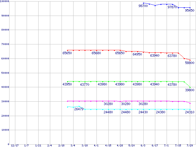 | LGA 775 (FC-LGA4 ,FSB 800MHz,L2 2MB,Hyper-Threading,Prescott,EM64T・EIST・NX bit対応)の最安値推移 | | | (2004年12月17日~2005年7月29日) |