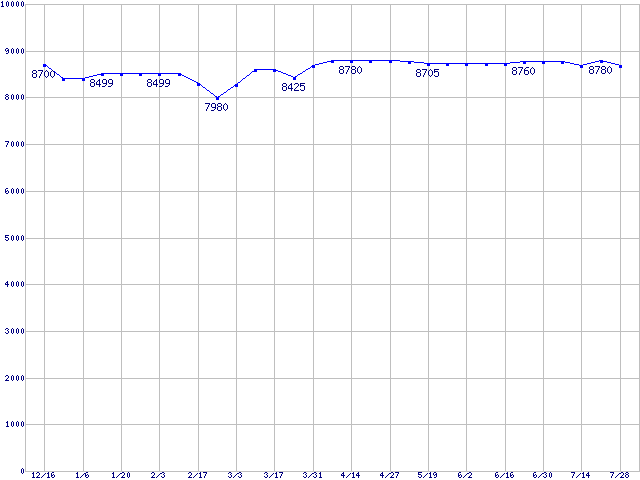 | DiamondMax Plus 9 (7200rpm,8MB,Serial ATA/150)の最安値推移 | | | (2004年12月16日~2005年7月28日) |