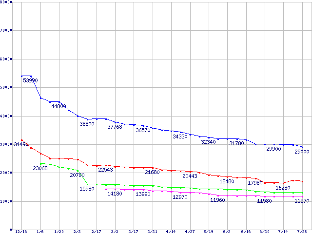 | Barracuda 7200.8 SATA (7200rpm,Serial ATA,NCQ,8MB,133GB/Platter)の最安値推移 | | | (2004年12月16日~2005年7月28日) |