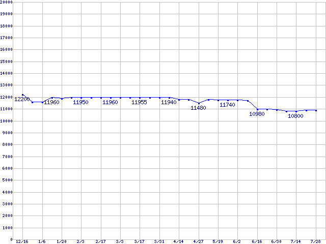 | Barracuda 7200.7 SATA (7200rpm,Serial ATA/150,8MB,100GB/Platter)の最安値推移 | | | (2004年12月16日~2005年7月28日) |