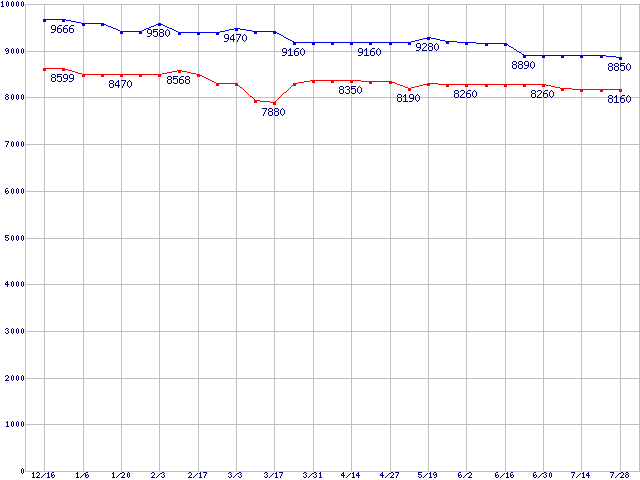 | Barracuda 7200.7 Plus (7200rpm,Ultra ATA/100,8MB,80GB/Platter)の最安値推移 | | | (2004年12月16日~2005年7月28日) |