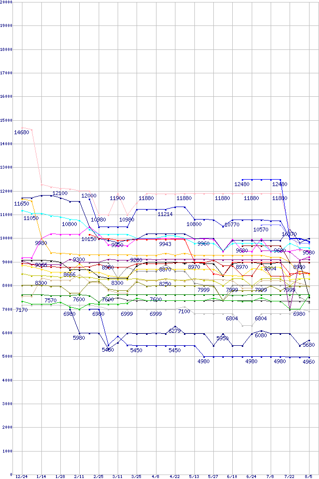 | CPU主要製品(最安値1万円未満)の最安値推移 | | | (2004年12月24日~2005年8月5日) |