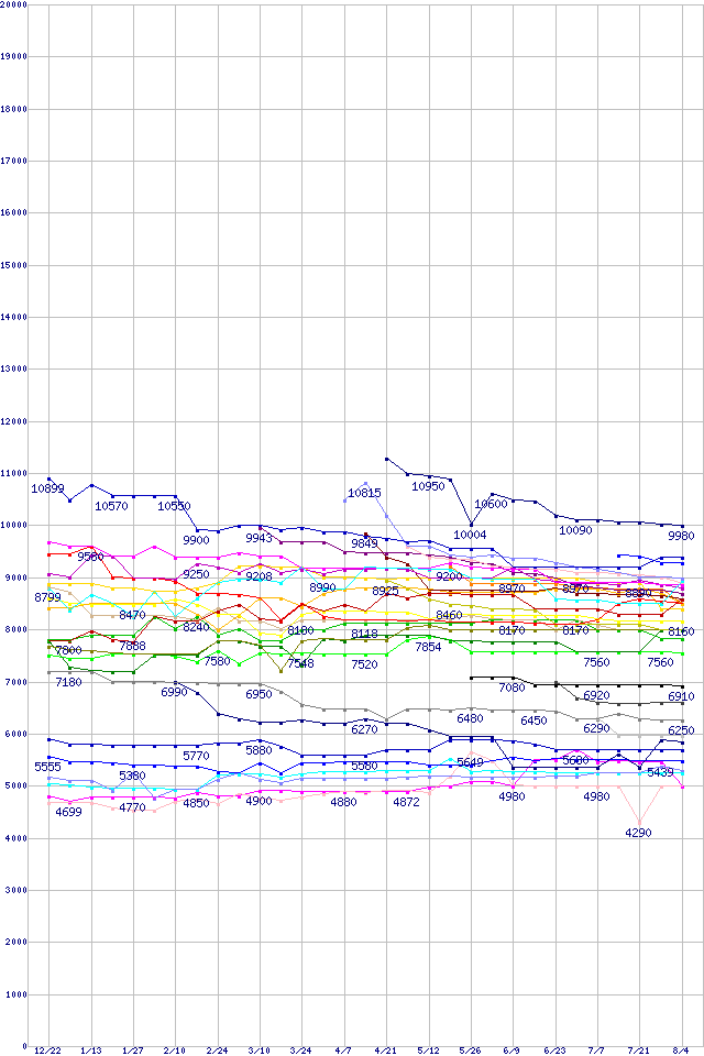 | HDD主要製品(最安値1万円未満)の最安値推移 | | | (2004年12月22日~2005年8月4日) |