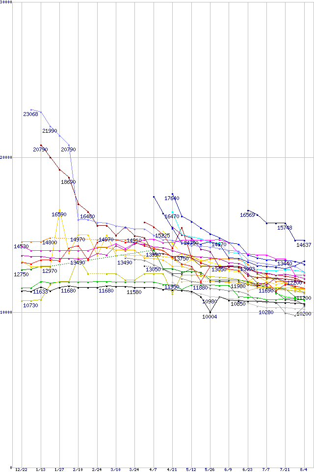 | HDD主要製品(最安値1万円~1万5千円未満)の最安値推移 | | | (2004年12月22日~2005年8月4日) |