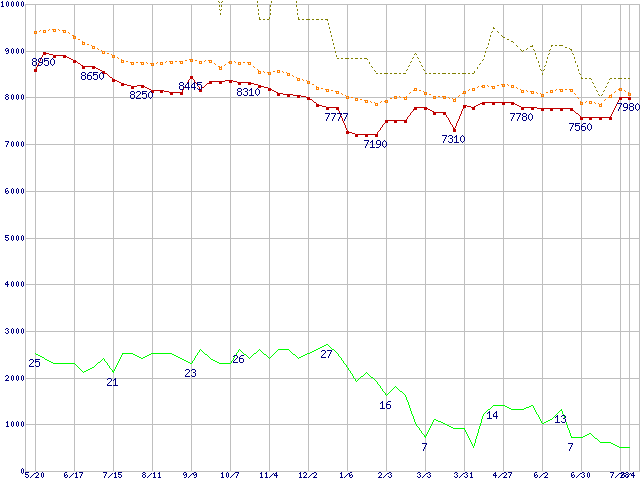 ※このグラフは過去のデータも税率5%相当に調整した税込み相当額のグラフです。 税率変更や、総額表示方式導入(2004年4月)の影響は除いています。 | | | ●凡例 | 最安値 (点線部は販売店未確認 または未調査) | 平均値 | 最高値 | ショップ数 |
