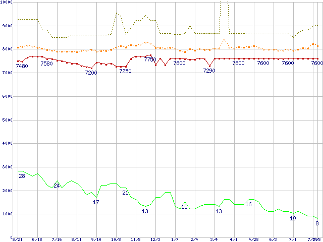 ※このグラフは過去のデータも税率5%相当に調整した税込み相当額のグラフです。 税率変更や、総額表示方式導入(2004年4月)の影響は除いています。 | | | ●凡例 | 最安値 (点線部は販売店未確認 または未調査) | 平均値 | 最高値 | ショップ数 |